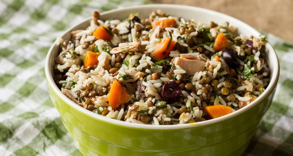 Παράλληλα βράζουμε το ρύζι σε μια μικρή κατσαρόλα με αλατισμένο νερό σε μέτρια προς δυνατή φωτιά μέχρι το ρύζι να μαλακώσει (σύμφωνα με τις οδηγίες του κατασκευαστή). Αφαιρούμε από τη φωτιά και σουρώνουμε το ρύζι και το προσθέτουμε στο μείγμα με τις φακές. Ανακατεύουμε καλά με ενα κουτάλι.